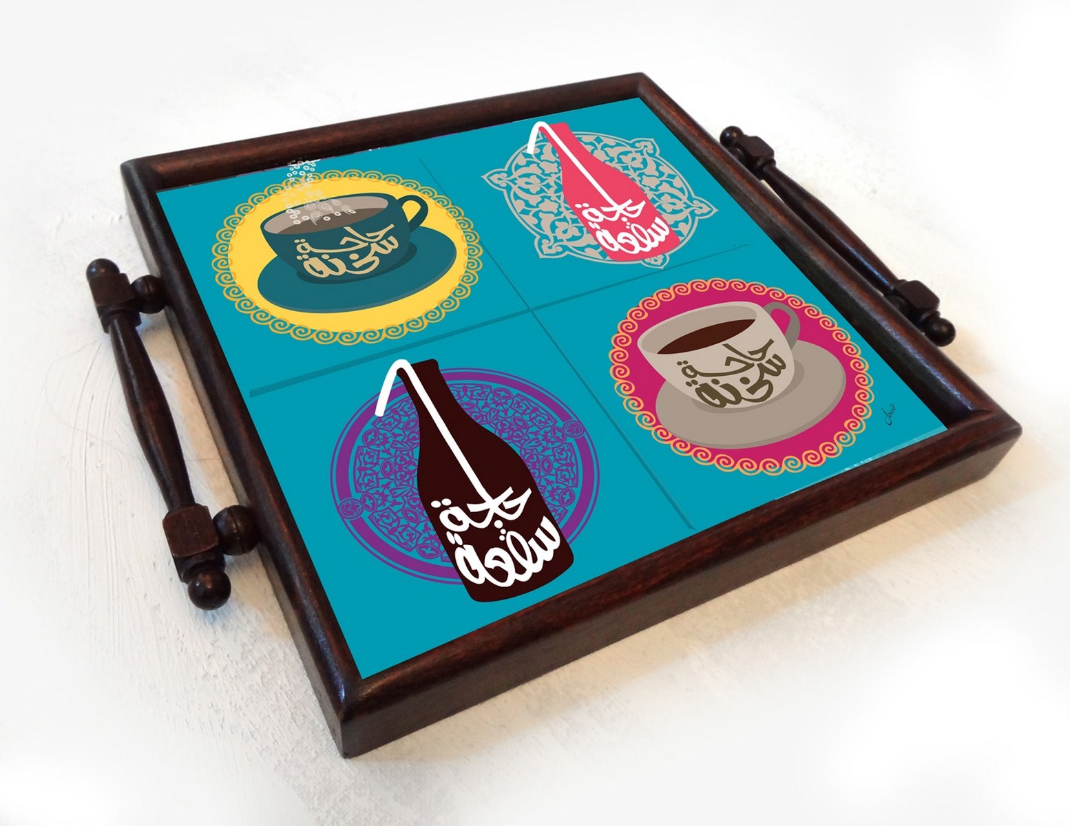 Invite friends over for a cup of tea or a cold drink served on this hip and vibrant coaster tray. Enjoy 7aga saメ3a or 7aga sokhna, something hot or something cold, in English.