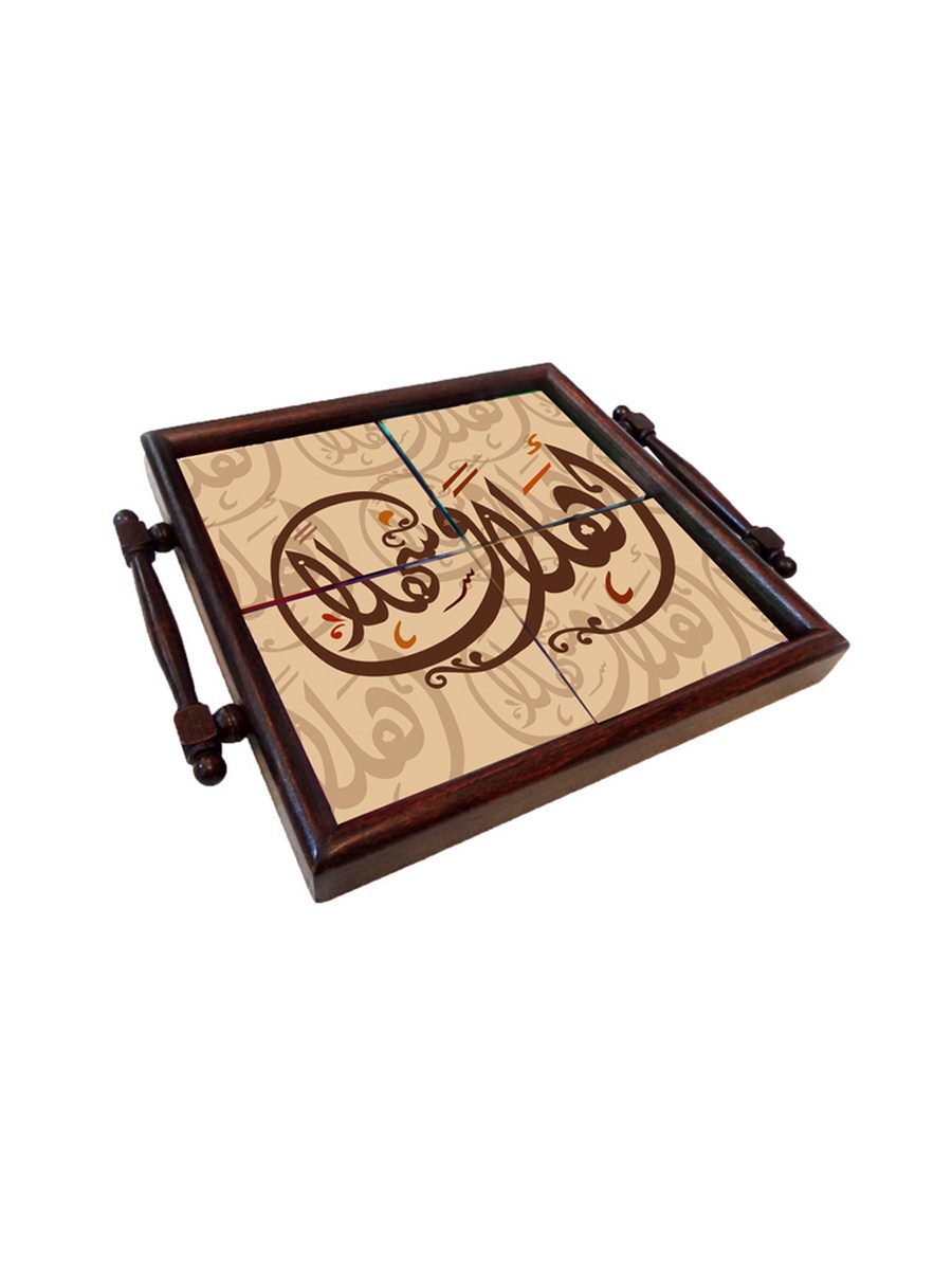 Nothing welcomes your guests more than this wooden tray with ahlan wasahlan, welcome in English, written on a white background.