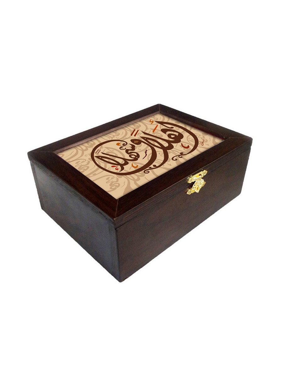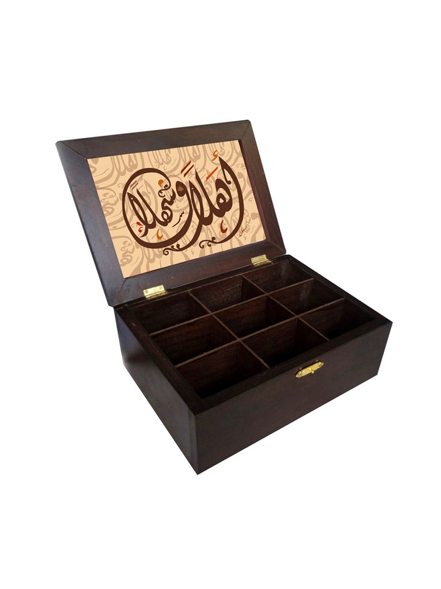 Serve up tea with this fun and practical 9-compartment tea box. Ahlan wasahlan, or welcome in English, is written both on the outside and inside of the wooden box’s lid.