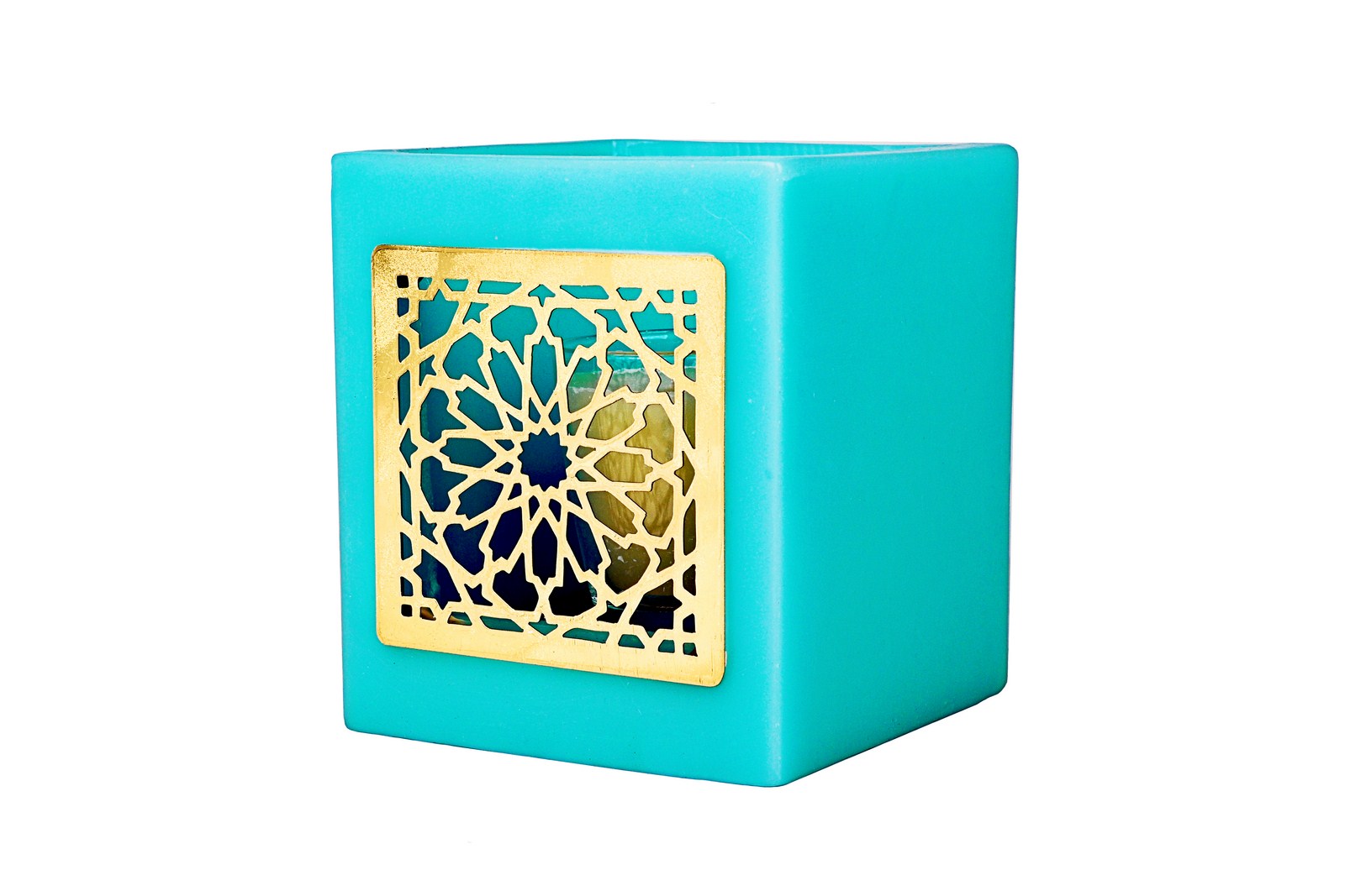 Inspired by Egyptian art, architecture and culture, the Arabesque pattern on this candle is hand cut from brass and embedded into a wax hurricane shell. When lit from within, the golden light reflects the brass radiating luminous rays; making it a stunning home accessory and gift.