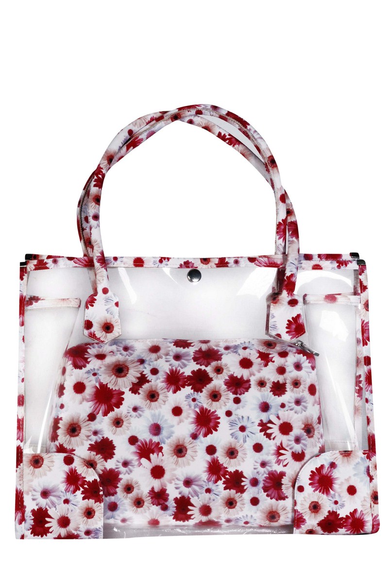 Floral beach bag contains transparent large bag with a medium pouch inside.