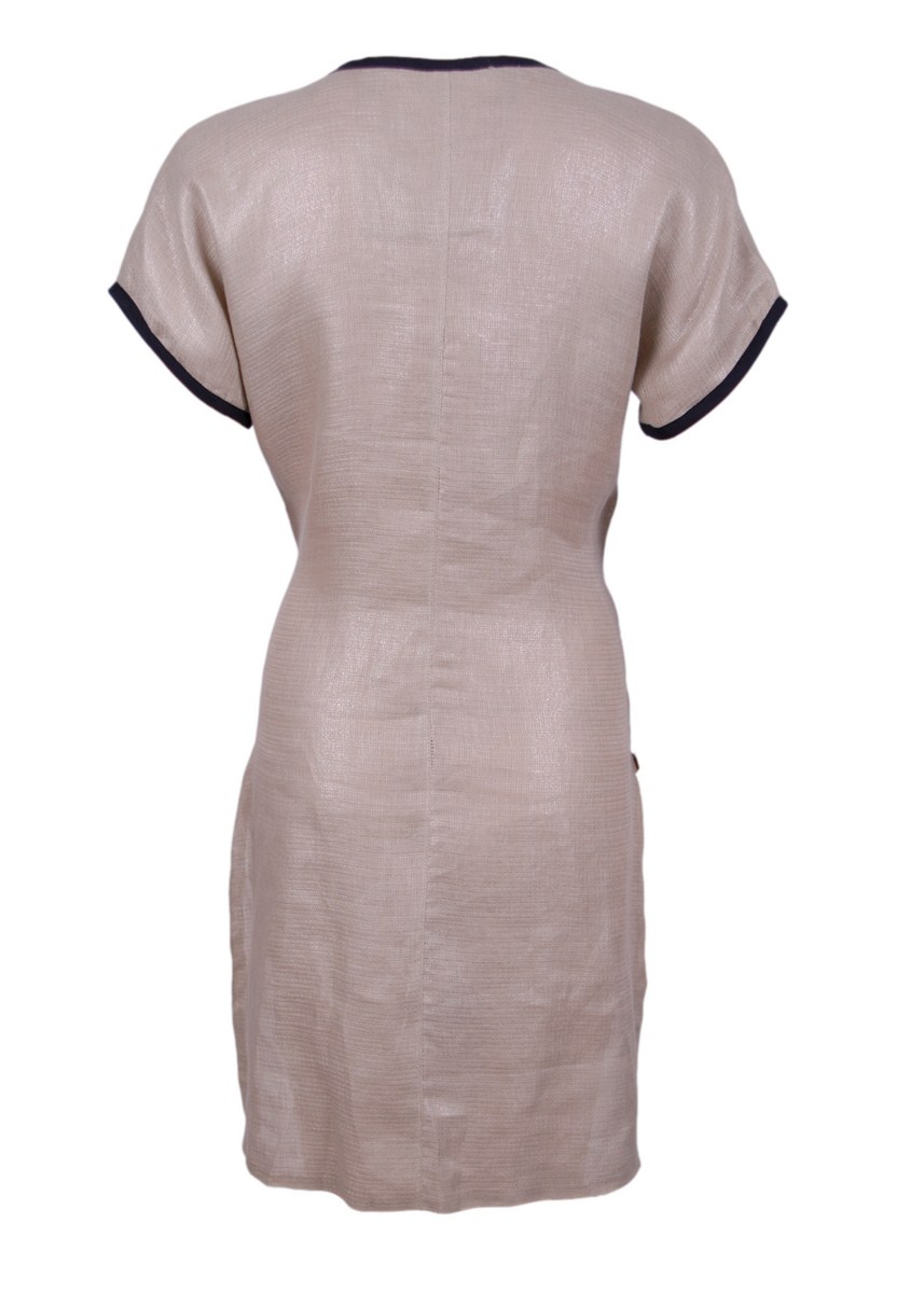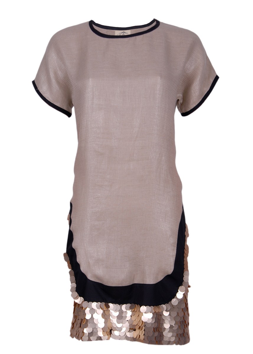 Combining a neutral colour like beige with striking gold embellishments is a definite fashion favourite. With dazzling gold sequins against the dressメs beige material, we love the simplicity of this piece. Pair with a pair of nude heels and a simple clutch.