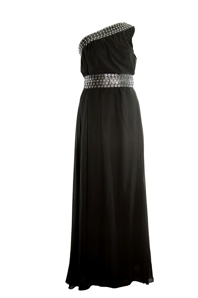 For an unforgettable evening look, opt for this elegant chiffon dress by Plush. The shoulder detail and removable belt give the dress that extra edge. Wear with high heels to elevate the long dress and a silver clutch to emphasize the shoulder detail.