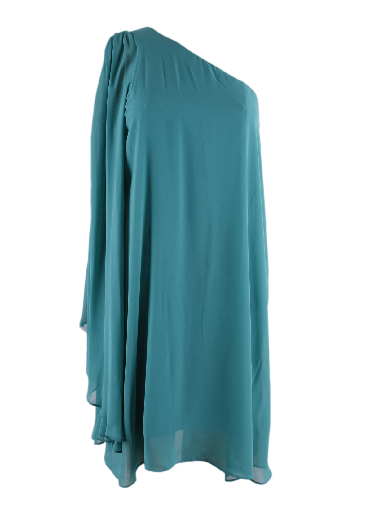 BLUE ONE SHOULDER CHIFFON DRESS WITH ONE SLEEVE A CHAIN HOLDS THE CHIFFON TO MAKE A LONG SLEEVE OR SLEEVELESS WHEN UNFASTENED