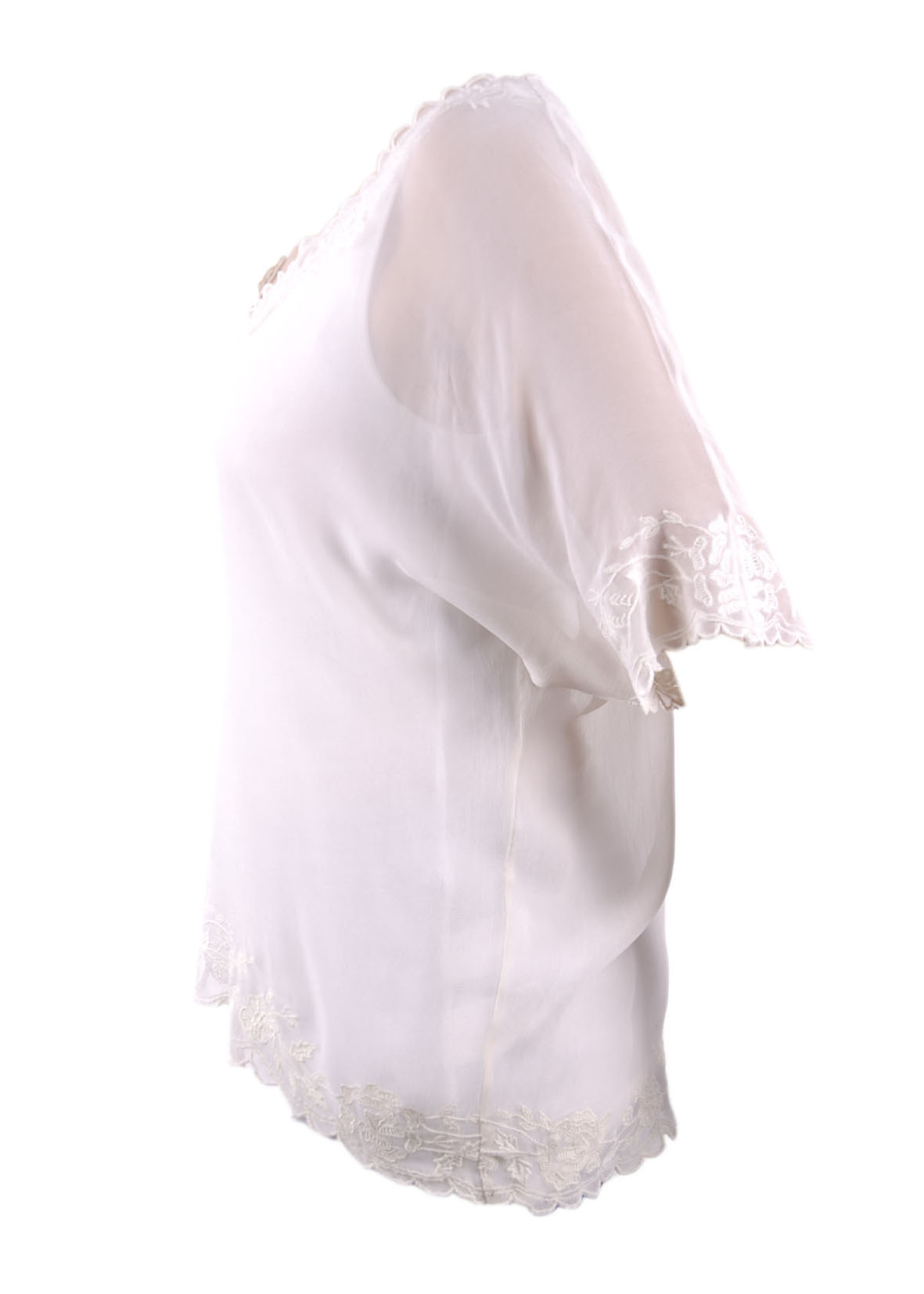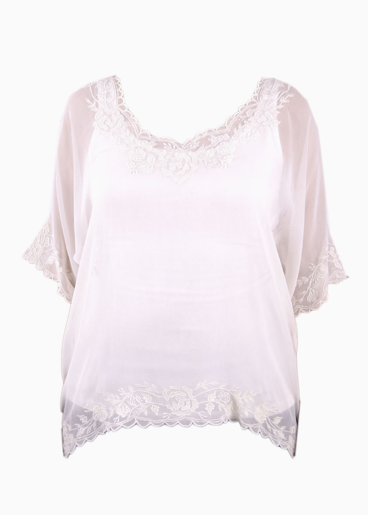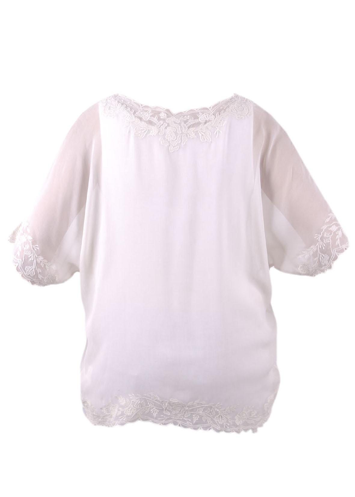This white Chiffon top is a romantic edge with floral and shoulder panels. Team it with similarly softly hued pieces for an easy, elegant look.