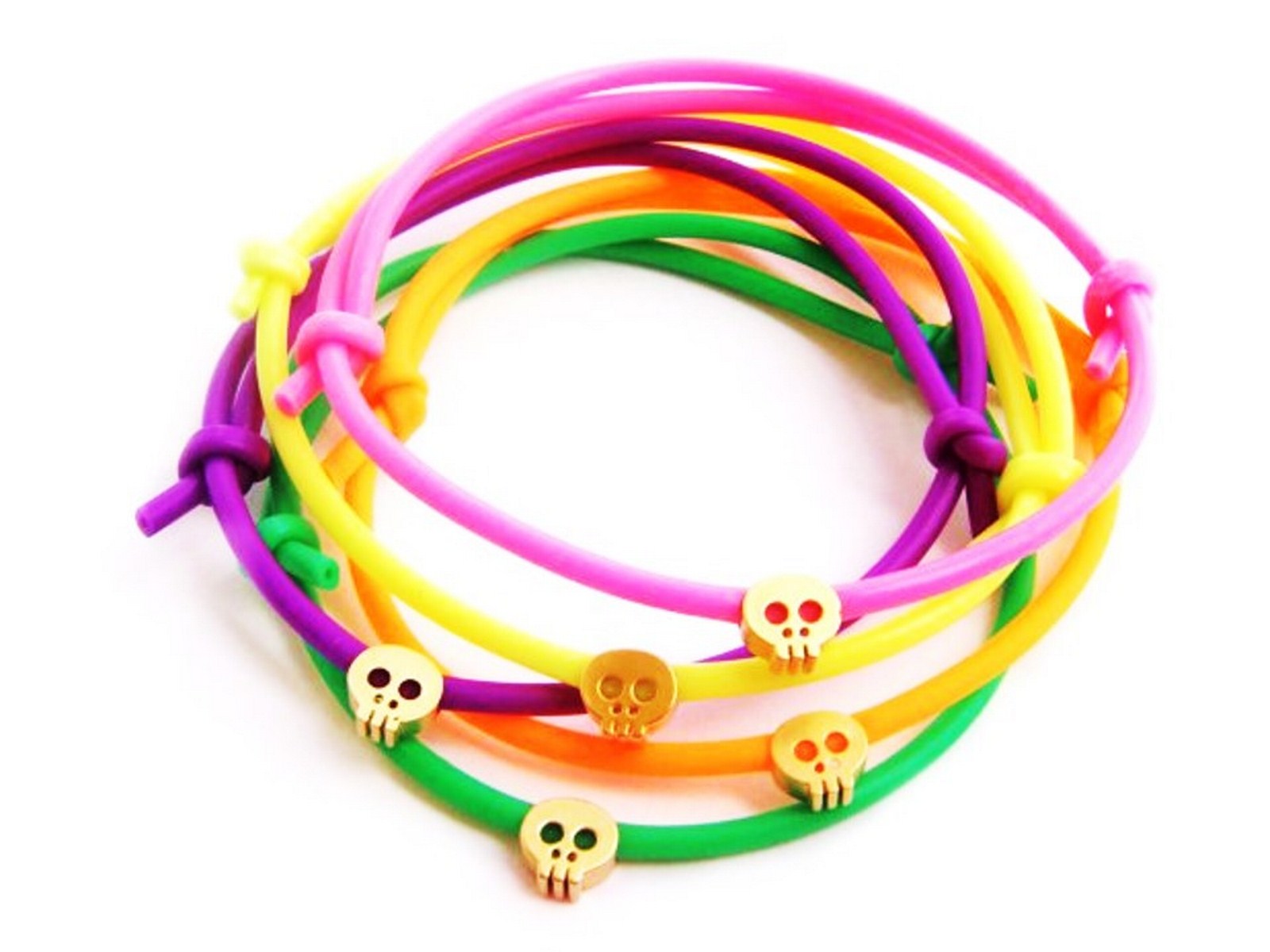 These coloured bracelets with small gold-plated skulls are vibrant and edgy at the same time. Wear them with an oversized white shirt and fuchsia flip-flops for a fun day out. *Sold separately.