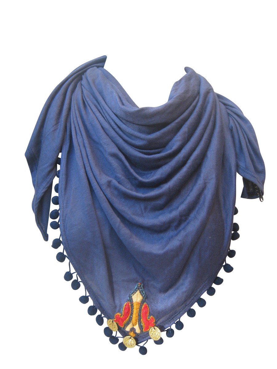Made of double layered cotton, this blue scarf is a staple piece for the upcoming weather. With coins and cotton balls outlining the scarf, this piece can be worn with an array of sweater colours. Wear with your hair tied back to show off the new show-stopping piece.