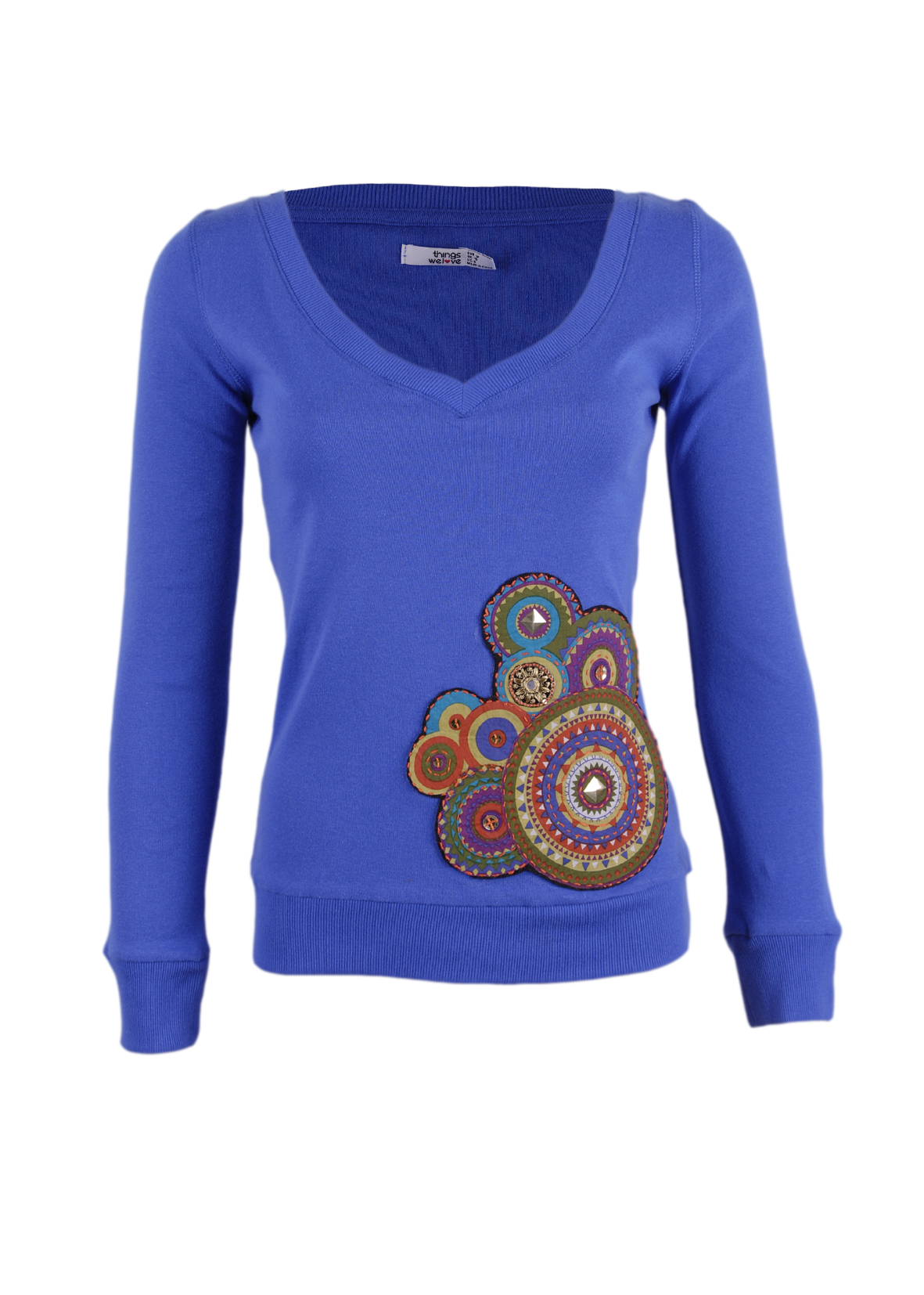 Heavy Cotton electric blue top with handmade mutlicolor motifs and beads