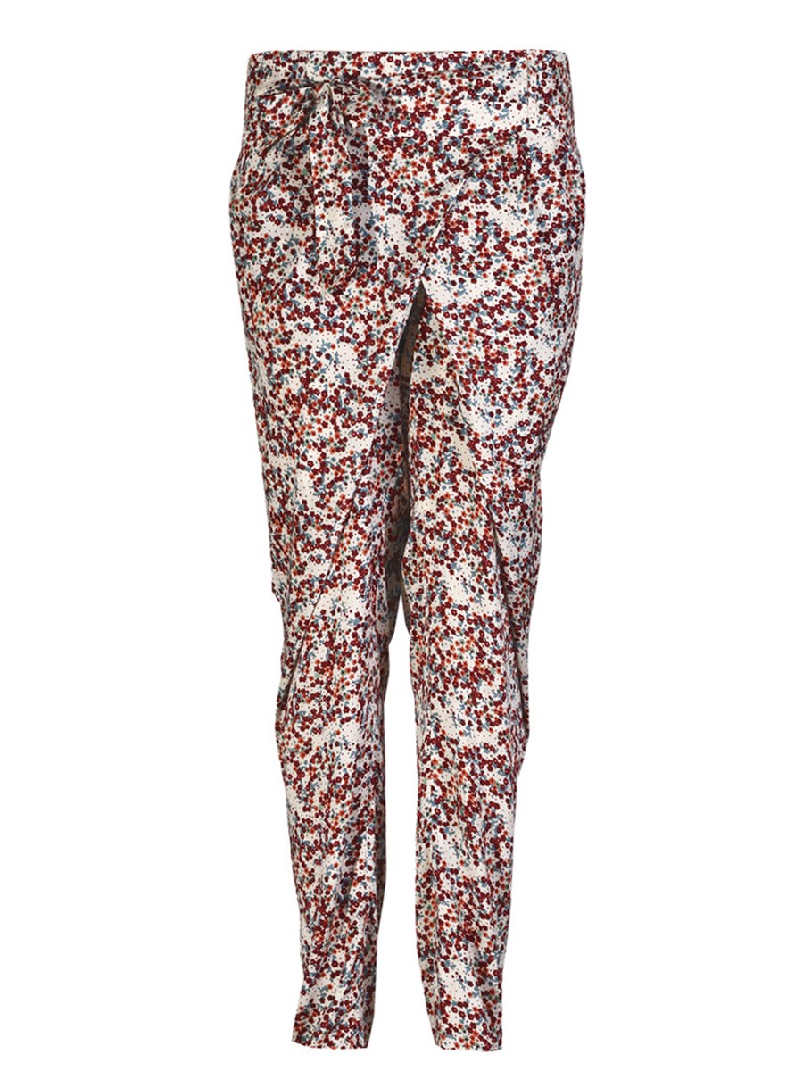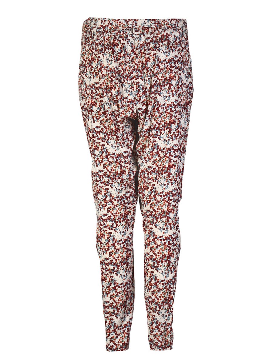 Floral print straight leg pants, the fabric loosely folding over from waist to thighs. Viscose.