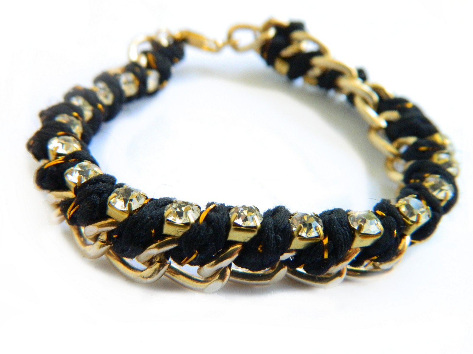 Grunge with some feminine flair, this bracelet is a statement maker. Adorned with gold and black rhinestones, team it up with a chiffon top and heels for a glamorous night out.