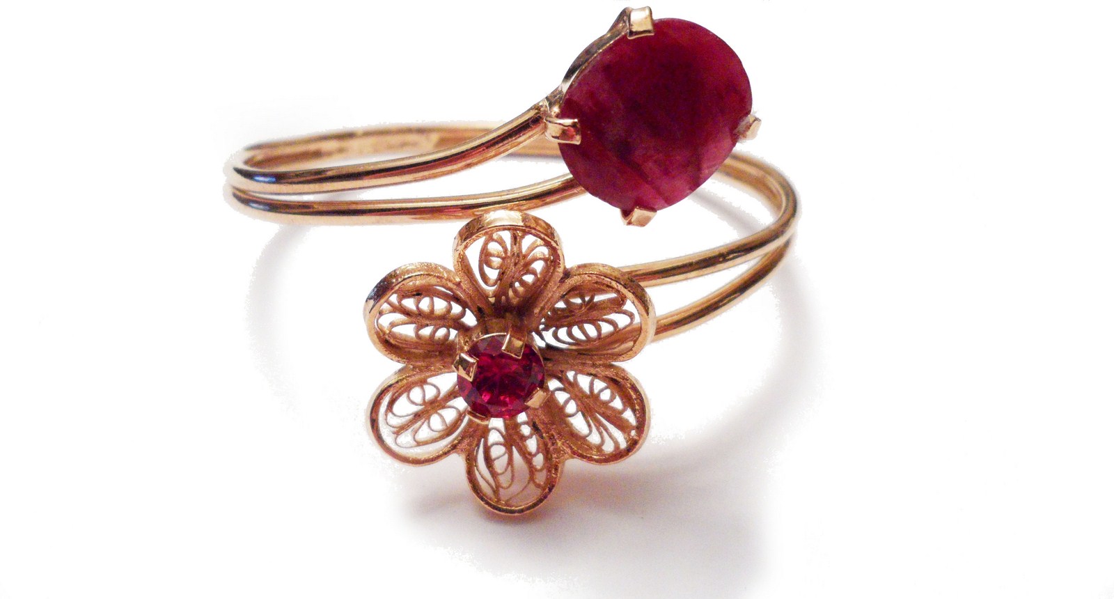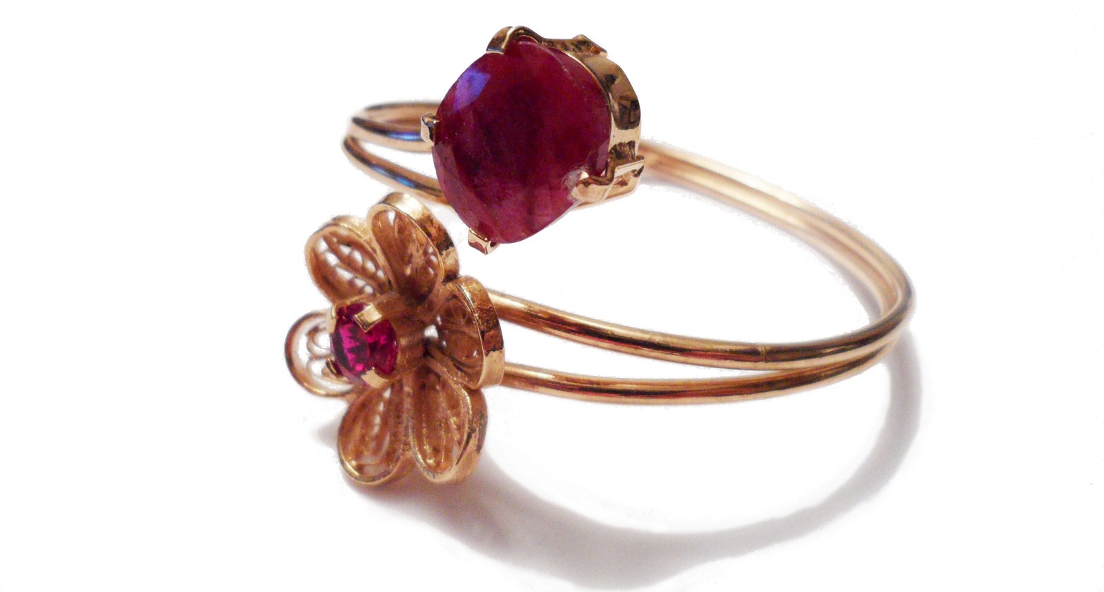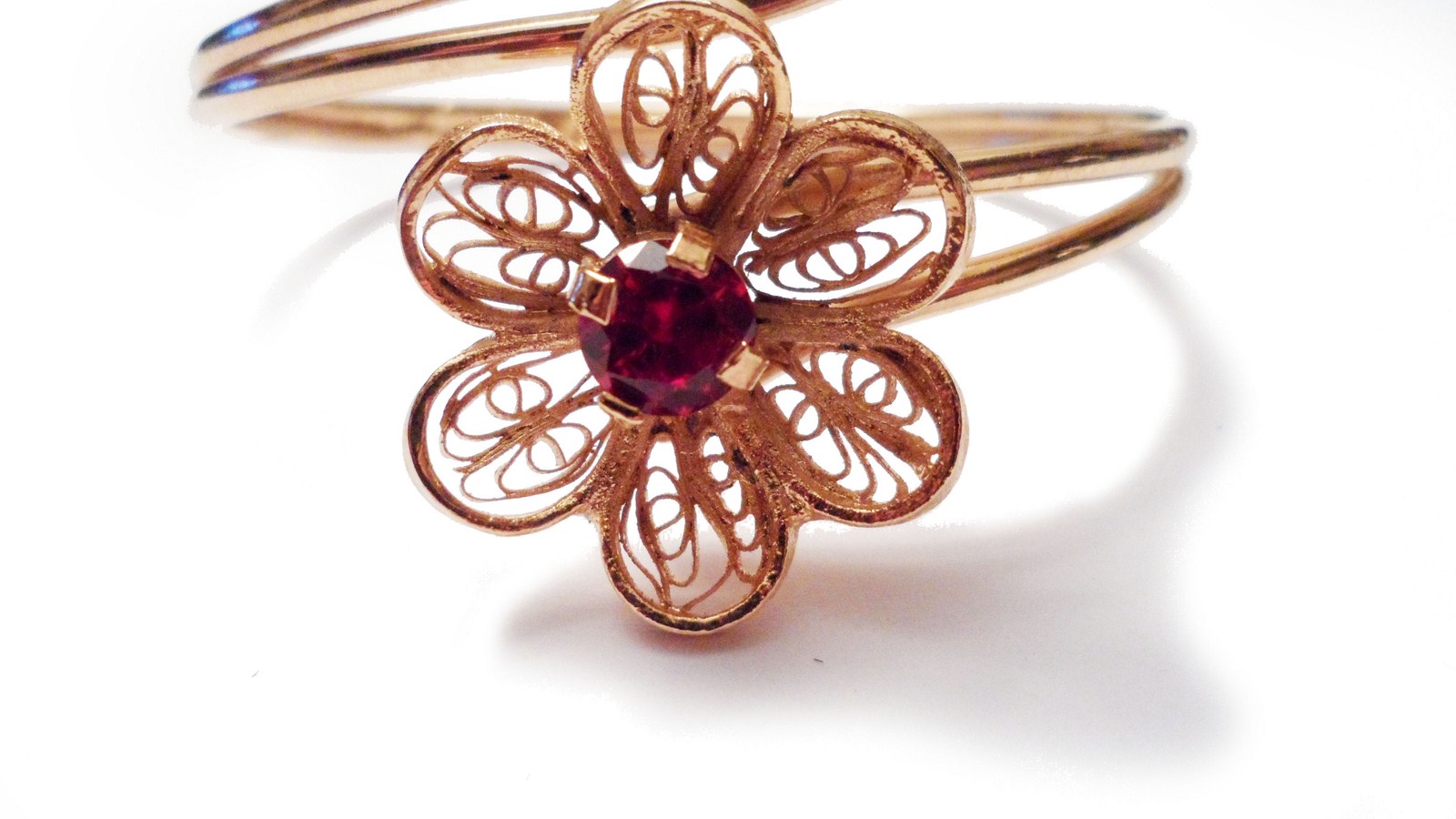A18 kirat gold plated bracelet cuff with ruby precious stone and a wonderful Arabic filigree flower with .a Yakut precious stone
