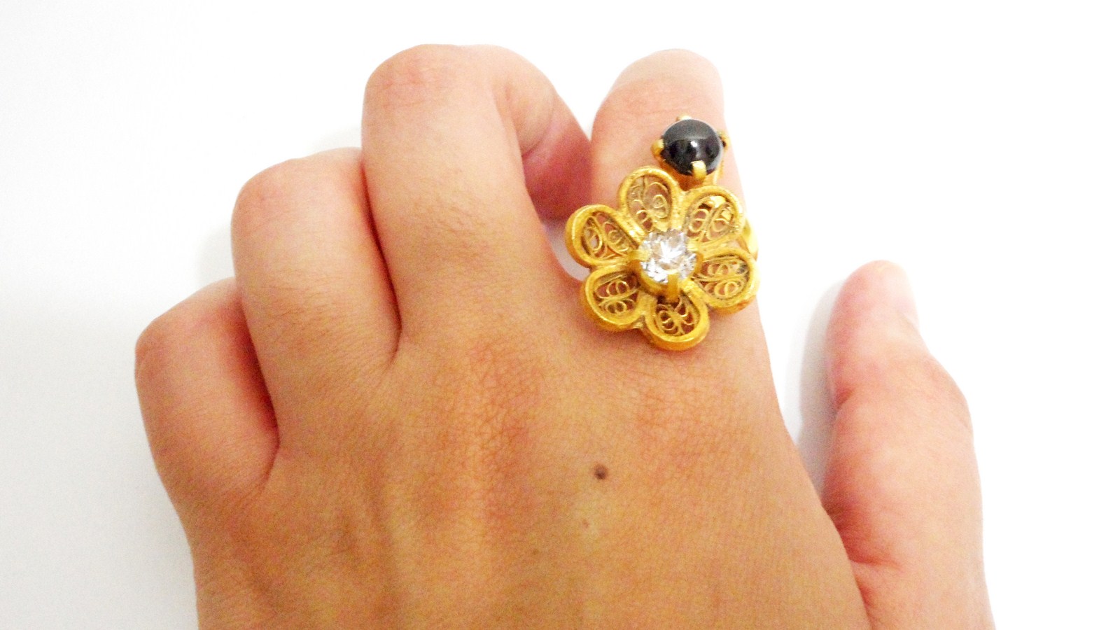21 carat gold plated ring with onyx precious stone and zircon stone.