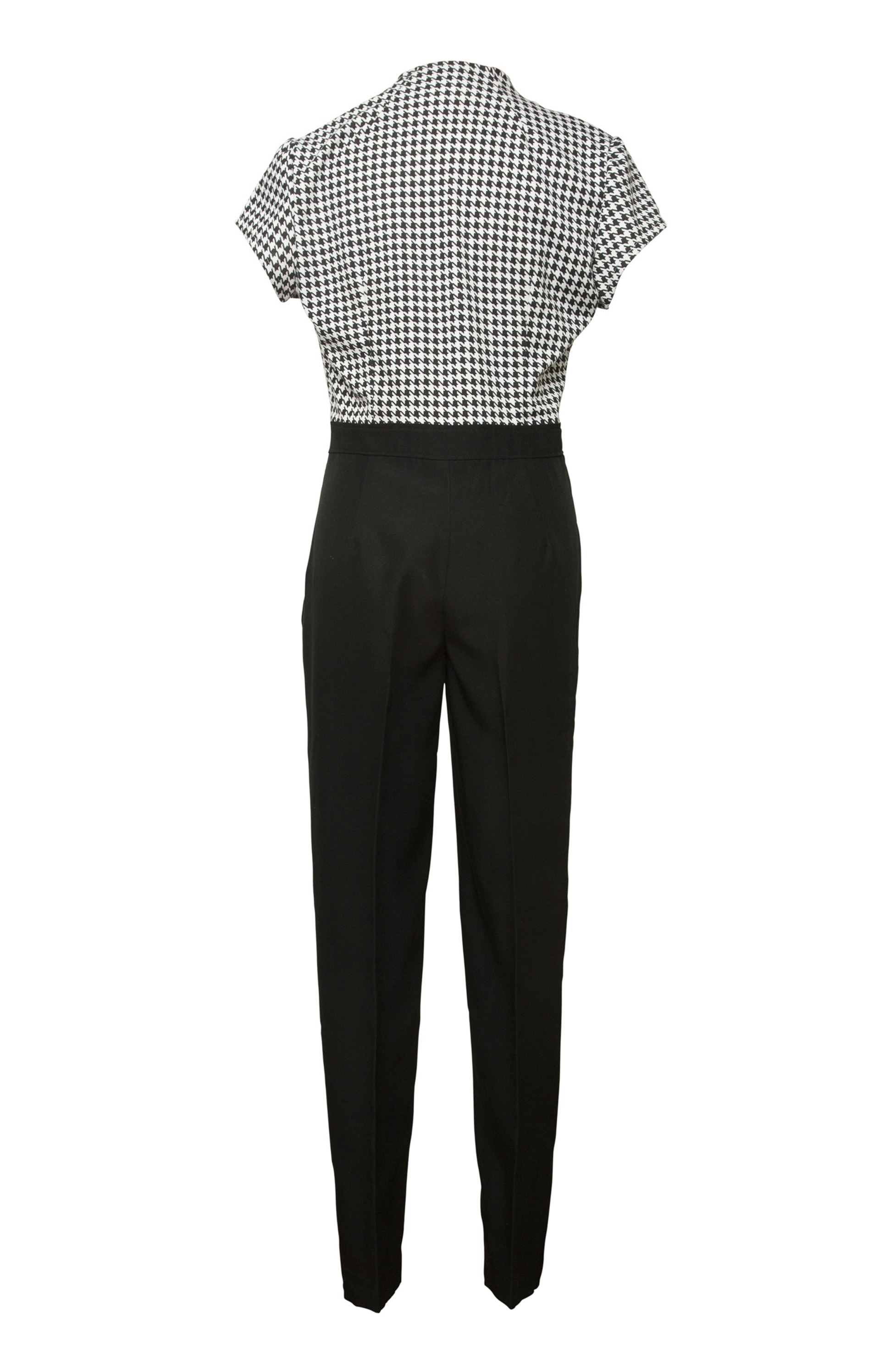 Make A Statement With This Unique Item. White With Black Houndstooth Pattern, This jumpsuit Has Flair. Wear It With Black, Black Heels, And Gold Accessories For An Elegant Outfit.