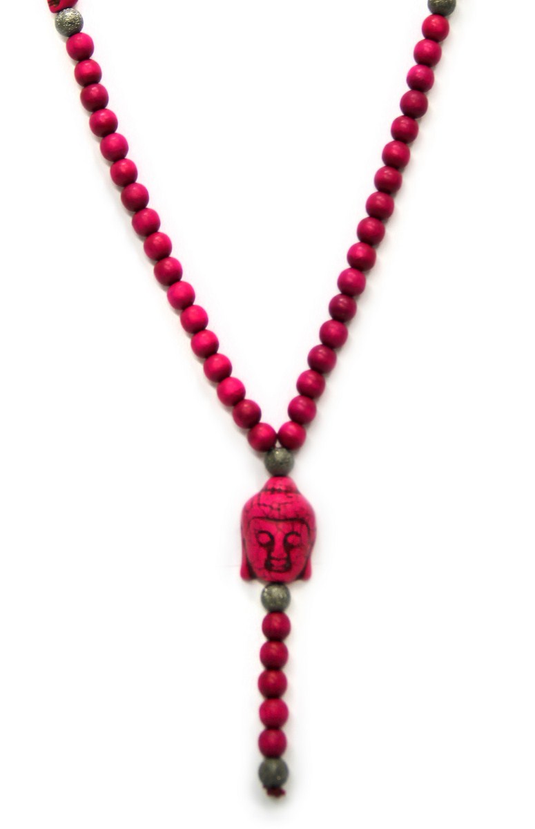 Beads dyed fuschia color with mini skulls in semi precious turquoise skulls dyed to fushia color and Indian Buddha in semi precious turquoise stone dyed to fuschia color.