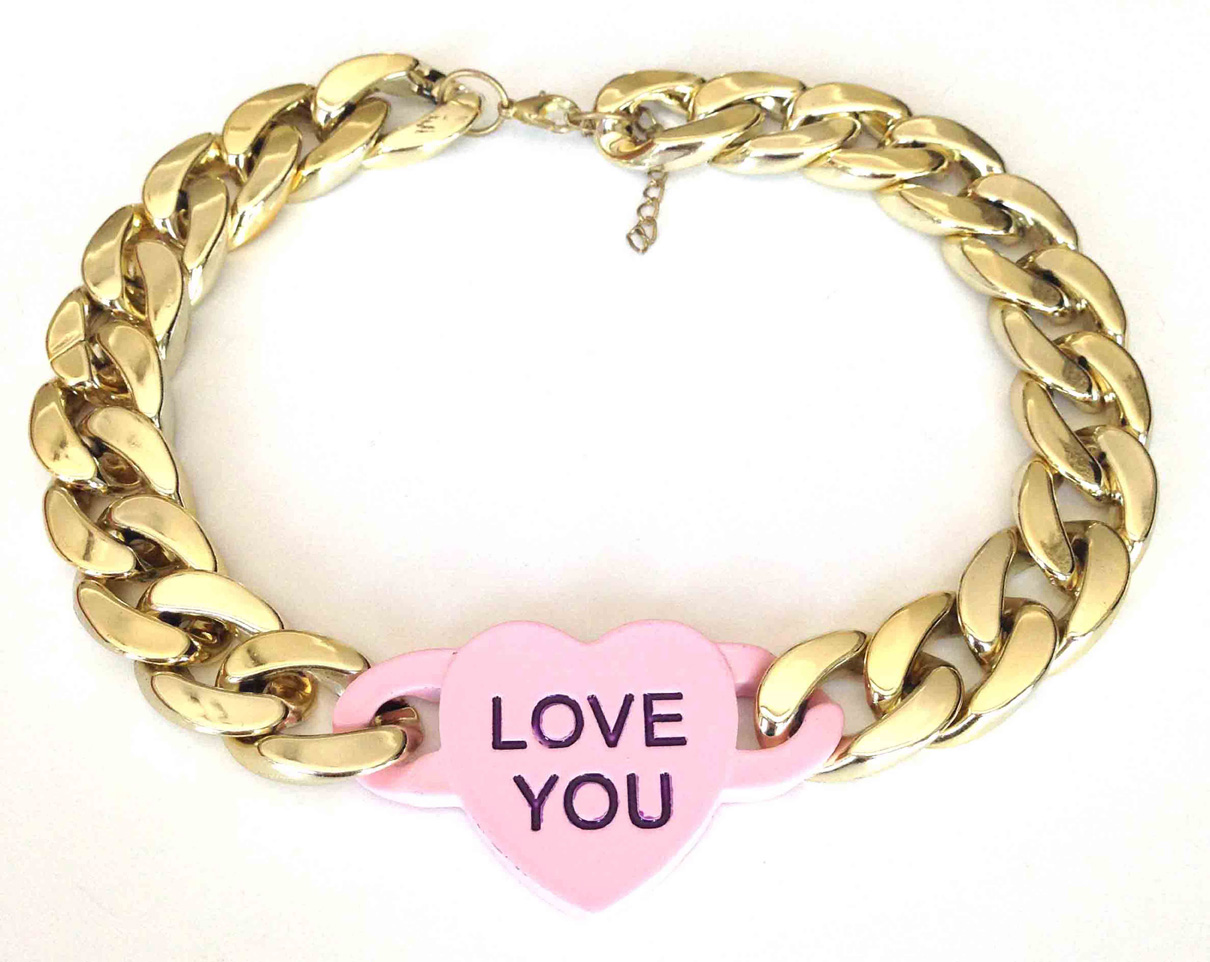 Add a quirky accessory to your outfit with this gold thick chain necklace. Featuring a heart written on it, balance out the bright colour with a simple white t-shirt and jeans.