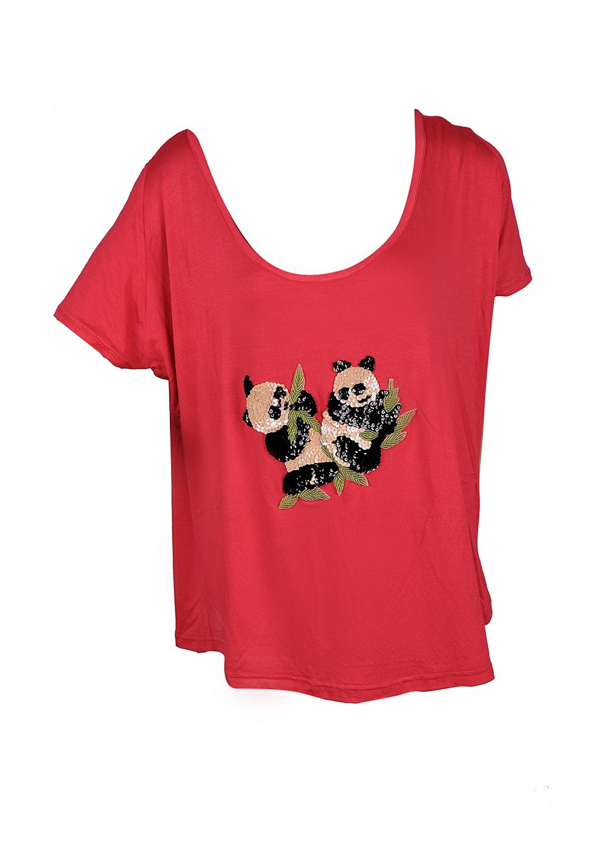 This simple T-shirt is a modern blend of sophisticated cool. With red cotton and sequins in the shape of pandas, this top is great to wear with your favorite jeans and flat ballerinas for a casual lunch.