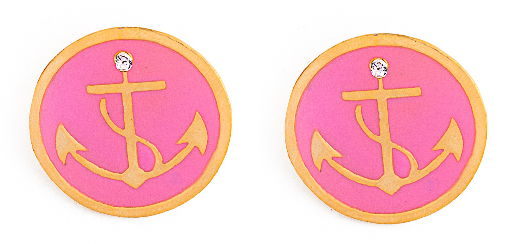 Simple and original, these round pink button earrings will add flavour to any outfit. With the subtle diamond adorning the top of the anchor, the pink background is striking against the soft orange contours.