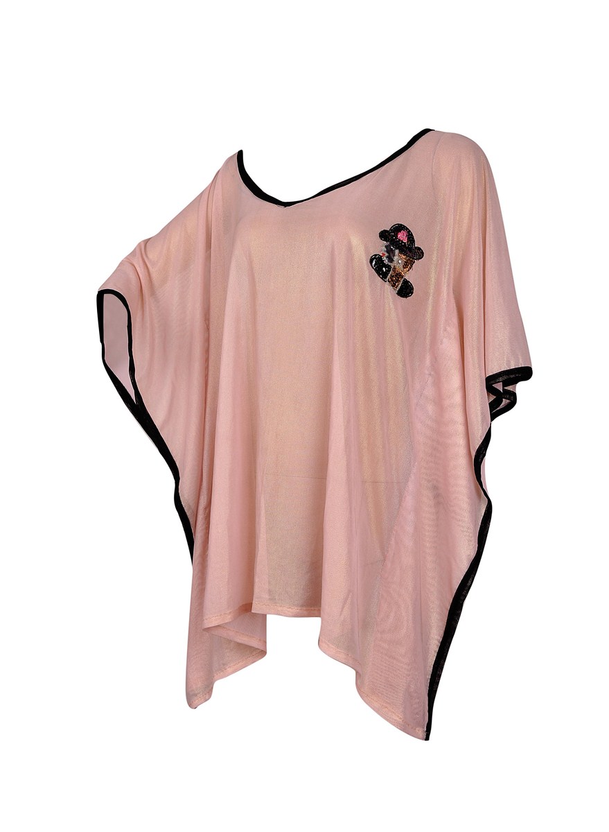 Pink metallic tulle top with blingy ladyメs silhouette edged by a black strip from both sides.