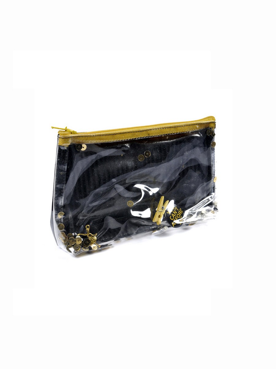 Now you can carry your belongings in style with this adorable pouch. The fabric is handpicked by the designer from her trips around the world. Its classic, striped black fabric, colourful yellow zipper, trinkets and ムYou Canメt Afford Meメ badge are sure to make you look (and feel) like a million bucks! And itメs also plastic and waterproof, making it perfect for a day on the beach.