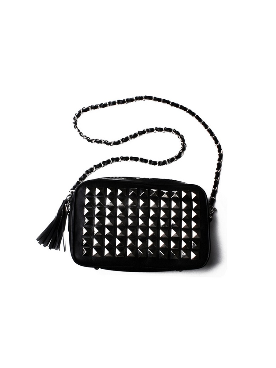 Add some edge to your outfits with this funky bag. With large pyramid studs and a removable chain handle, it adds a fashion forward touch to anything you wear. Pair it with a fitted biker jacket and silver rings for a truly modern look.