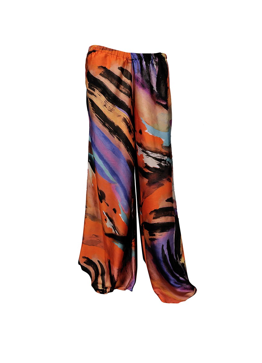 The new seasonメs bold prints are perfectly interpreted with these satin pants by Norane Khaled. Loose-fitting with a colourful print, wear them with a muted sweater and a clutch for a great look.