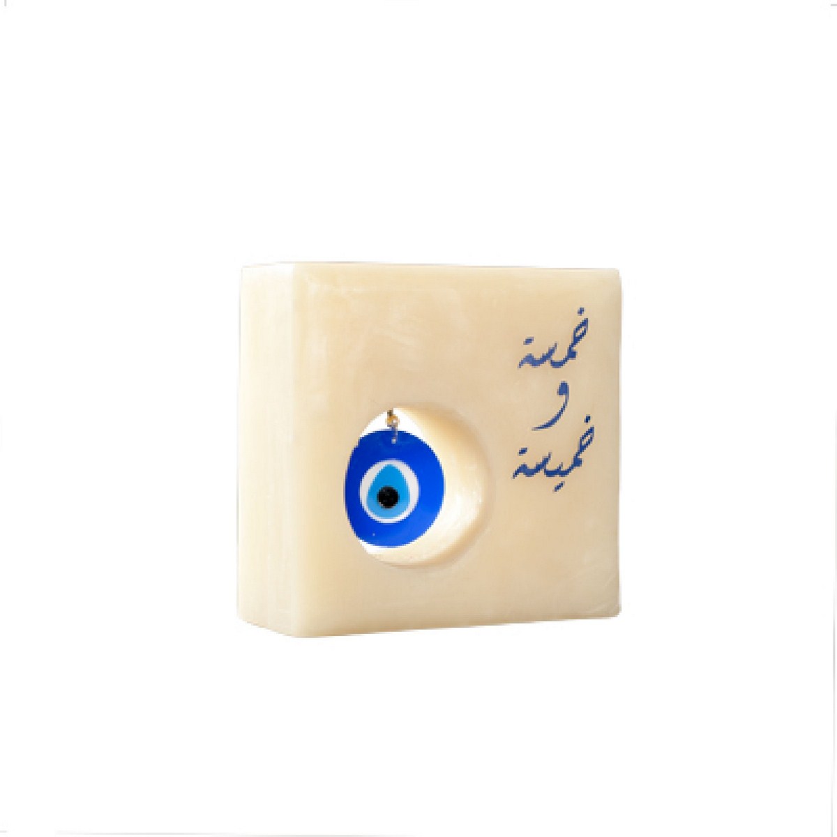 Add tradition to your home with these modern window candles. With a Plexi Blue eye and an Arabic superstitious saying モKhamsa W Khmesaヤ (Five and Five), these unique candles can be placed with similar coloured home accessories for a stylish effect.
